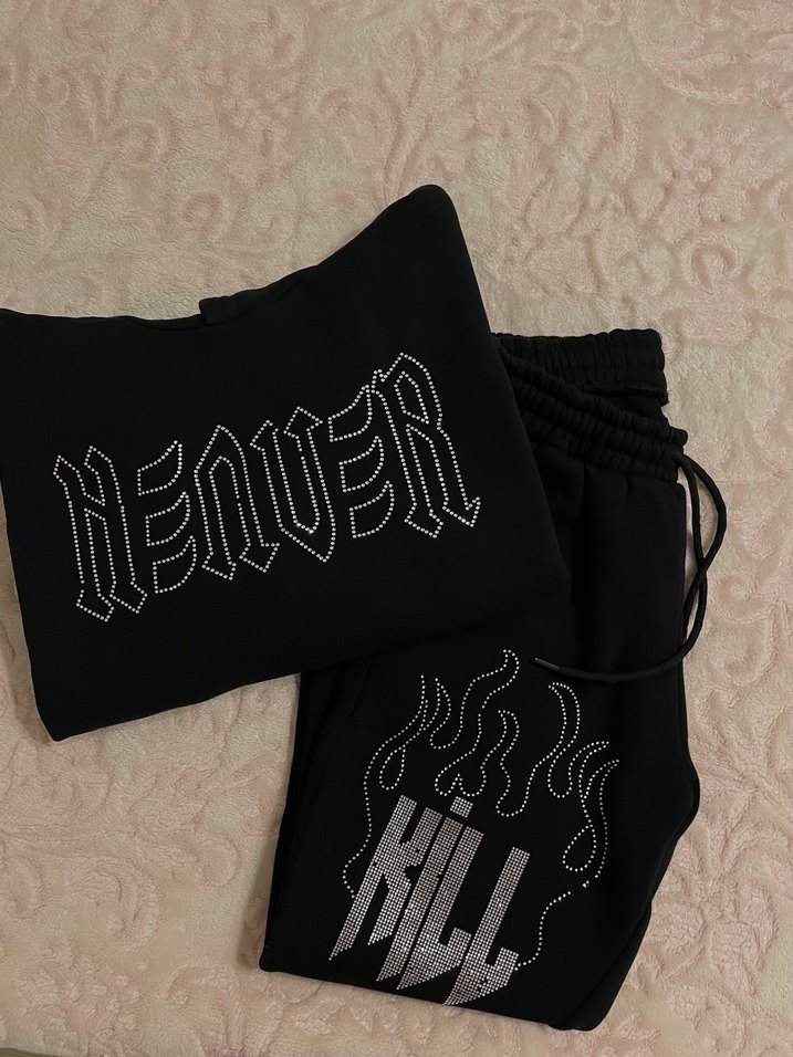Yumuşak ve sıcak kumaştan siyah, baskılı, bol kesim kadın eşofman takımı Fermuarlı cepleriyle günlük sokak stiline uygun, rock punk havasında.