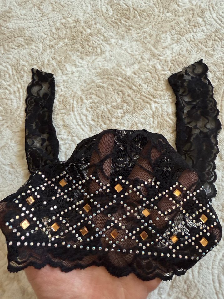 Siyah dantel kumaş üzerinde detaylı ve taşları bulunan bone
