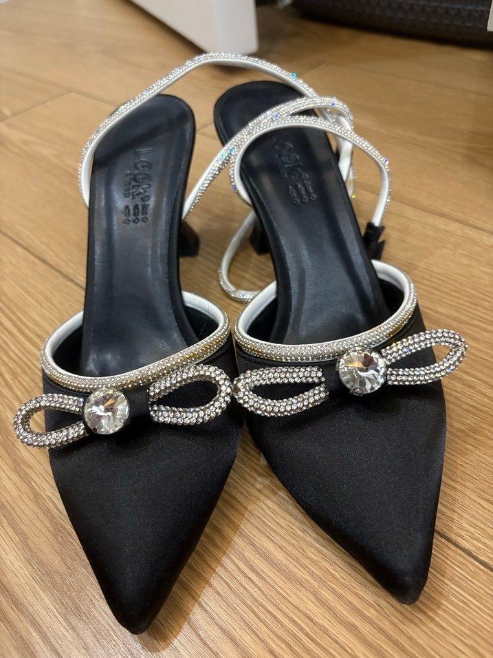 Parlak siyah stiletto topuklu, taşlı fiyonk ve ince askı detaylarıyla düğünler için uygun.
