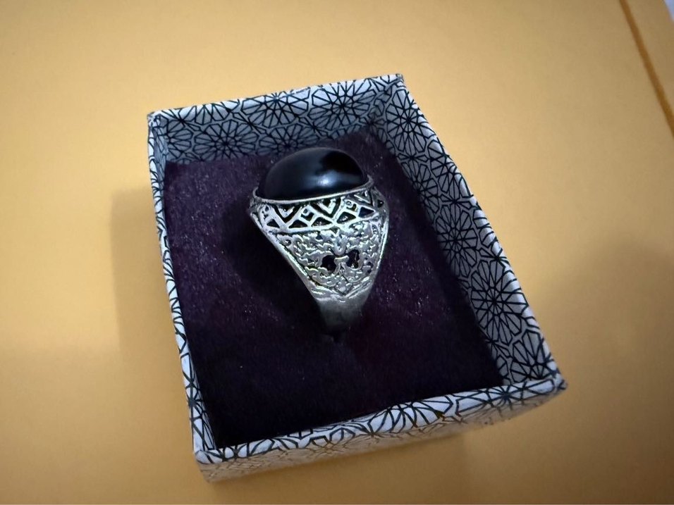 Koyu siyah taş ve detaylı desenli gümüş tonlu bant ile gotik ve retro tarzda erkek yüzük çeliktir
