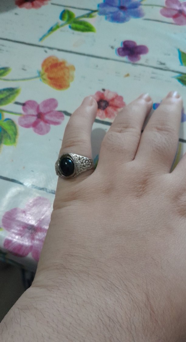 Bu erkek yüzük, gotik ve retro tarzları yansıtan işlemeli gümüş bant üzerinde koyu siyah taş içerir.
