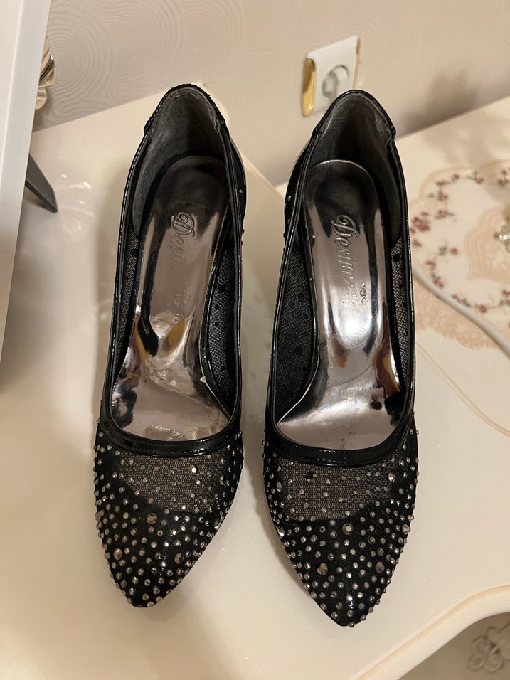 Siyah yılan desenli ve payetli detaylara sahip topuklu kadın ayakkabısı, kauçuk tabanlıdır. Romantik gece için şık bir seçim. ✨