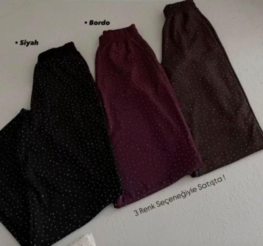 siyah renk, payetli, rahat kesim midi kadın kumaş pantolon. Yumuşak sentetik kumaştan, günlük kullanım için uygundur. Üç renk seçeneği mevcut. ✨