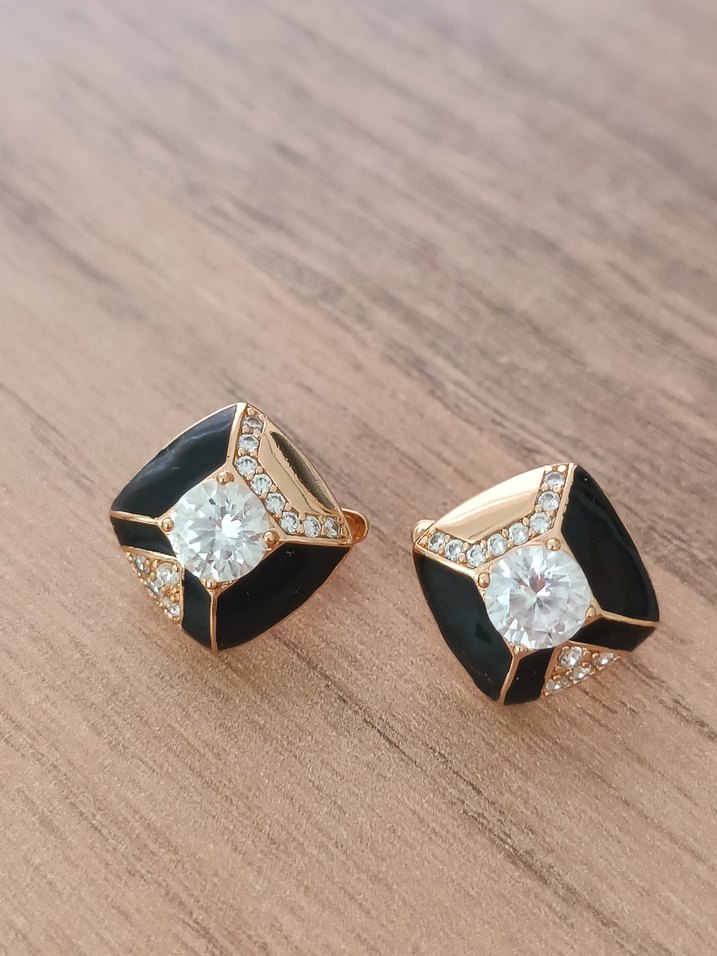 Siyah payetli desenli, ortasında parlayan taş bulunan kısa uzunlukta çağdaş küpeler.