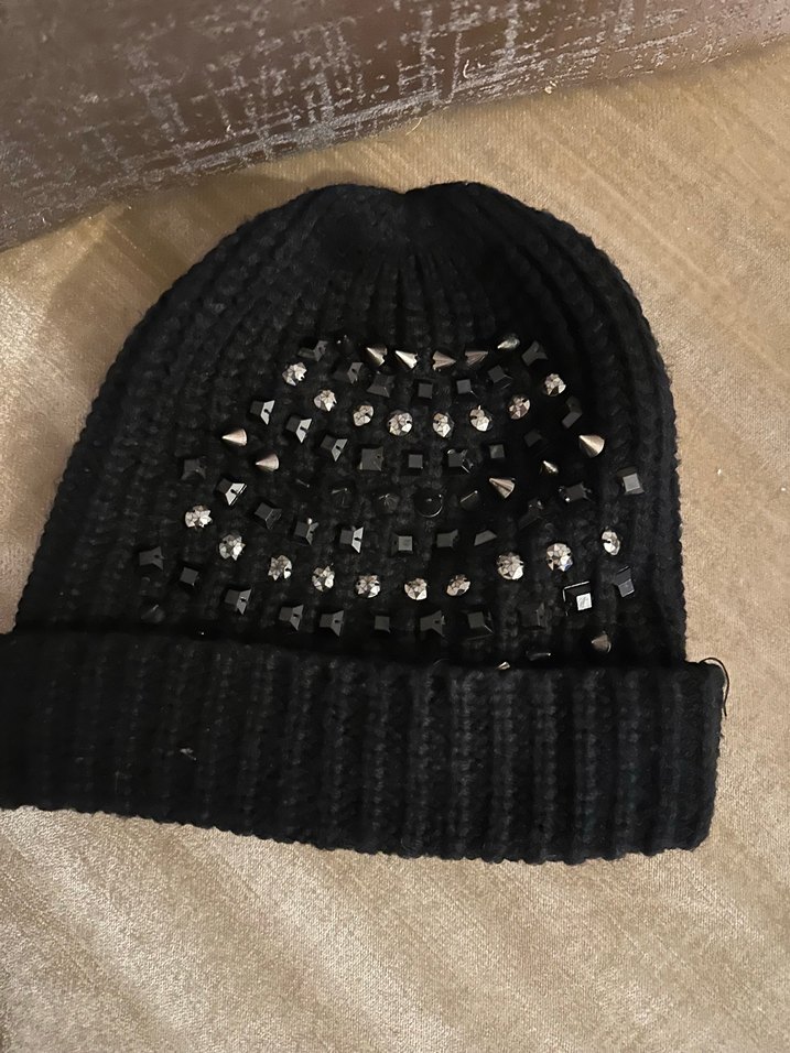Siyah örgü kadın bere, taş ve kristal süslemelerle gotik ve rock punk tarzını yansıtıyor.