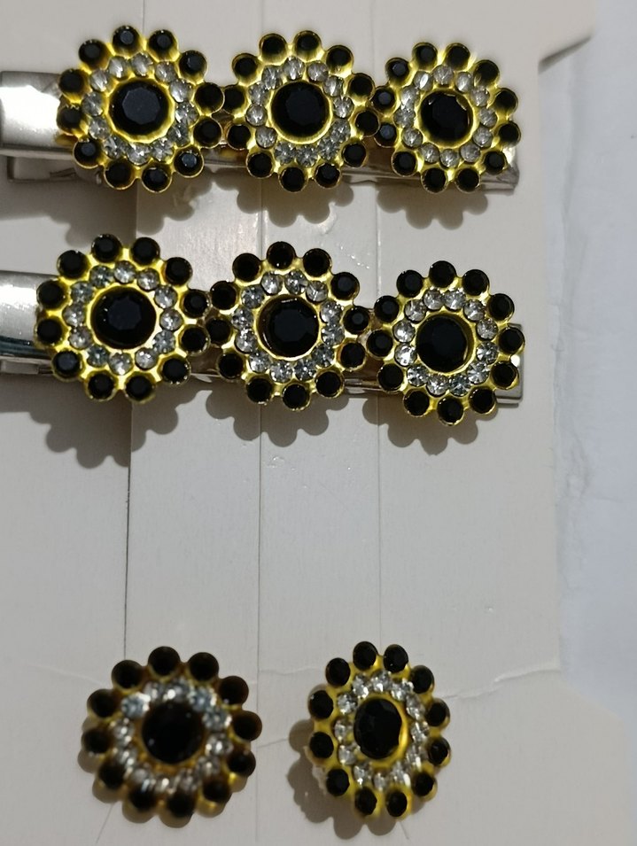 Bu set, siyah ve altın renkli parlak taşlarla süslenmiş saç tokaları ve küpeler içerir. Plastik malzemeden yapılmış, klasik ve göz alıcı bir tasarıma sahiptir. ✨