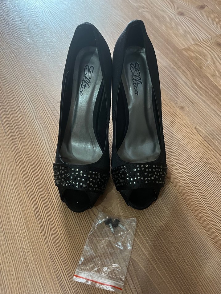 Siyah taşlı, tokalı ve yılan desenli platform topuklu abiye ayakkabı. Ürün görselde göründüğü gibidir.