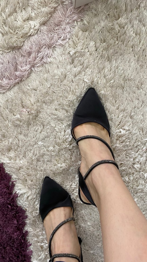 Siyah taşlı şeritli saten topuklu ayakkabı