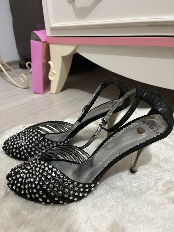 Siyah stiletto topuklu, taşlı detaylara ve yılan derisi desenine sahip, romantik geceler için şık ve gösterişli ayakkabı.
