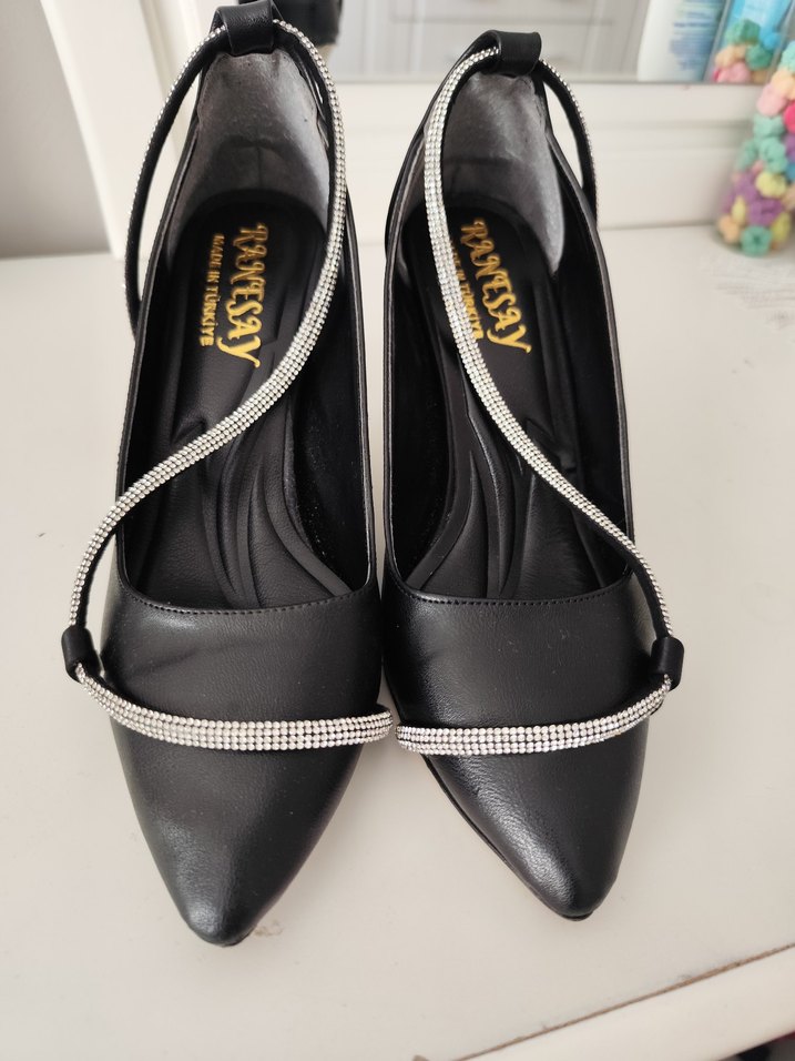 Siyah taşlı stiletto 39 numara topuk boyu 7cm 2 kez giyildi
