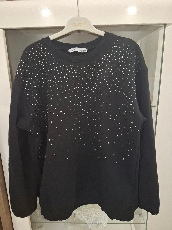 Siyah, uzun kollu, yuvarlak yaka ve bol kesim sweatshirt. Ön kısmında taş işlemeleri bulunur. Yumuşak sentetik kumaştan üretilmiştir, rahat sokak stili için uygundur. iki koltuk arası 65cm boy 63cm