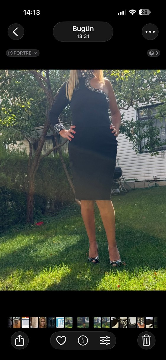 Tek kollu ve elmas rengi taşlı tasarıma sahip siyah kalem elbise. Sentetik kumaştan üretilmiş, dış mekan kullanıma uygun, desensiz ve koyu renkte midi boy. 1 kez kısa süreli giyildi,tertemiz ışık ışık şık bir r elbise. Ünlü bir markanın ama etiketini kesmiştir,bu fiyata kaçırmayın.