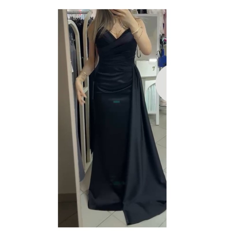 Siyah uzun abiye elbise, straplez yaka ve drapeli tasarıma sahiptir. Strappy kollu, regular fit ve modern klasik stilde, düğünler için uygundur. ✨