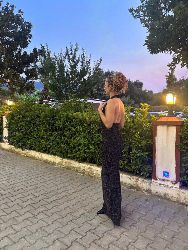 Siyah taş desenli, V yakalı, sadece bir kere giydim . Adl’den özel tasarım olarak aldım sınırlı sayıda tasarlanan elbisedir. Vücudu çok güzel gösterip beli sarıyor. Xs’ye de olur. 10000tlye almıştım
