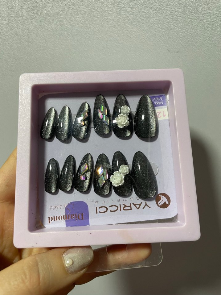 Koyu parlak siyah tırnak süslemeleri seti, taşlar ve 3D çiçek detaylarıyla şık bir görünüm sunar.