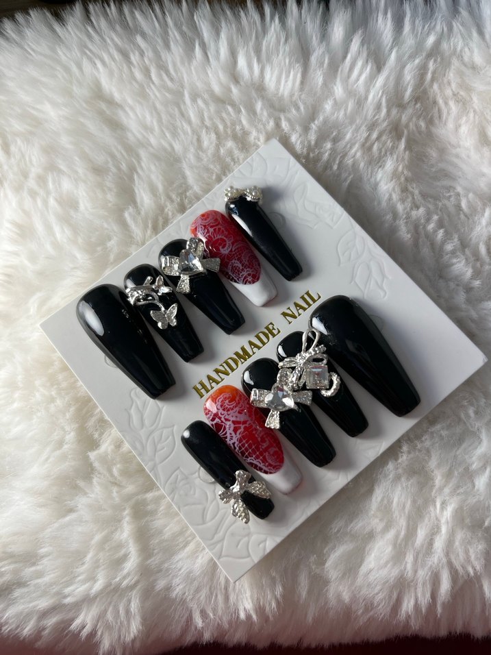 Siyah ve koyu kırmızı desenli tırnak süsleri, gümüş kelebek ve fiyonk detayları içerir.el yapımıdır.