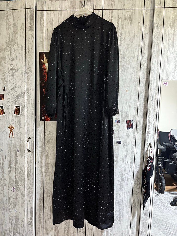 1 kez gıyıldı .Siyah, uzun kollu, yüksek yakalı, nakışlı ve pul işlemeli ipeksi kumaştan yapılmış uzun elbise, romantik akşamlar için ideal. İçinde prenses gıbı hıssedecegınız ışıl ışıl bir elbise
