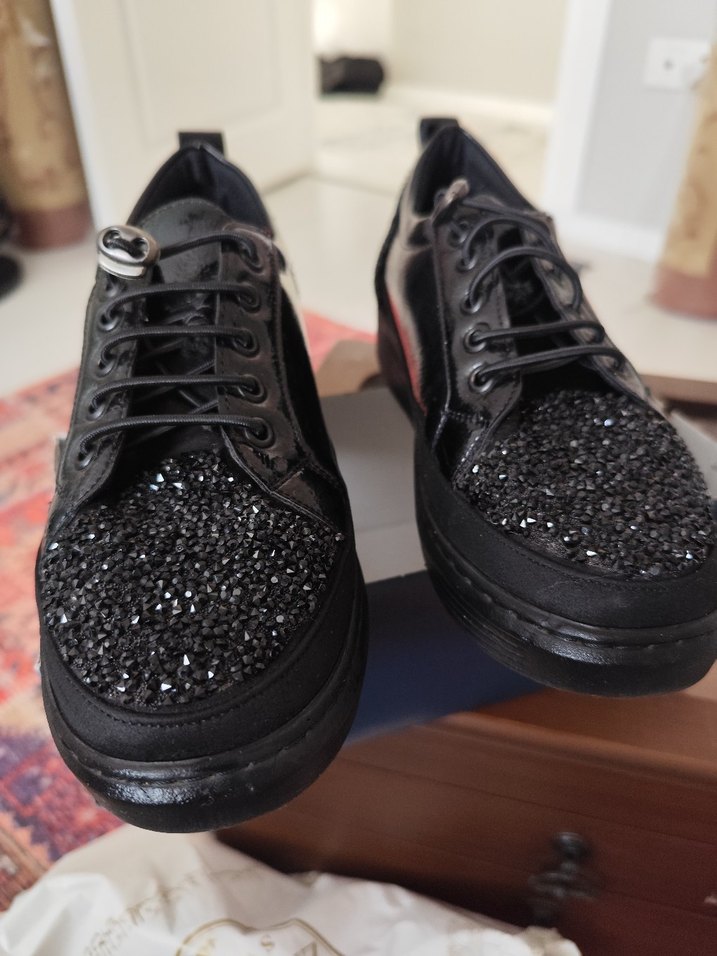 Siyah taşlı detaylara ve kauçuk tabana sahip yüksek topuklu kadın spor ayakkabısı. Gotik sokak stilinde, trend bir günlük kullanım ayakkabısı.