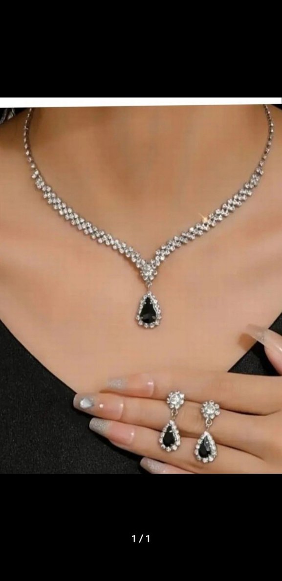 Siyah damla taşlar ve parlak kristallerle süslenmiş zarif kolye ve küpe seti, şık davetler için uygundur.
