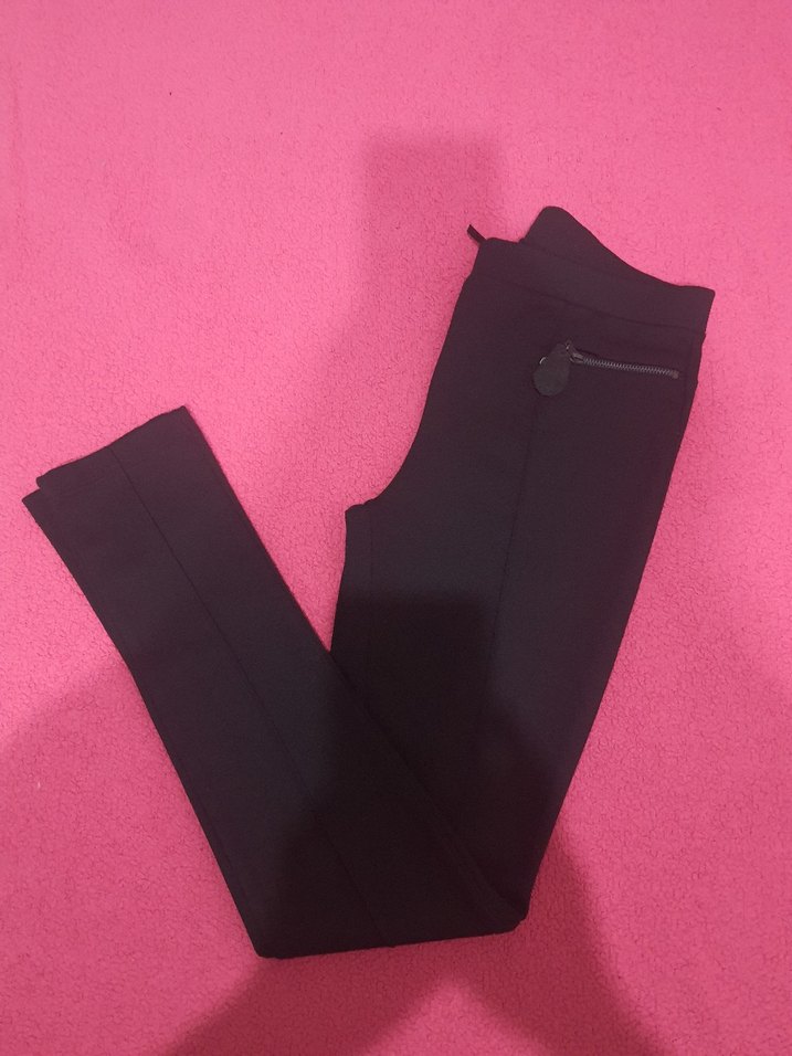 Fermuarlı cep detaylı, dar kesim siyah kumaş pantolon. sentetik kumaştan, günlük kullanıma uygun şık bir parça. sadece bir kez giyildi ve yıkanmıştir tertemiz sorunsuz, beli lastikli