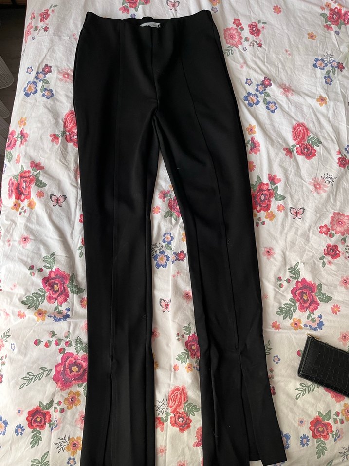 Siyah, normal boyda, dar kesim kadın kumaş pantolon. Sentetik kumaştan, günlük şık sokak stiline uygun.bilek kısmında öne doğru açılan yırtmacı mevcut