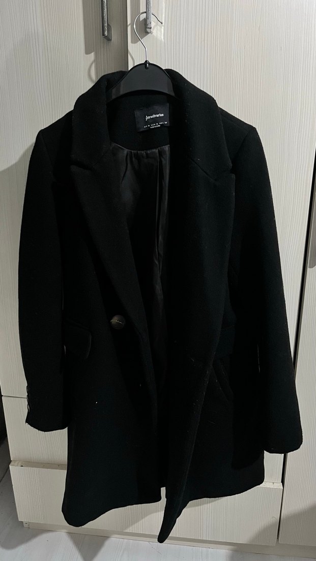 Klasik yakalı, tek düğmeli siyah kaban, pürüzsüz astarlı ve şık tasarımlı. Artık tarzıma uymadığı için satıyorum hiçbir sorunu yoktur resimde görüldüğü gibi.