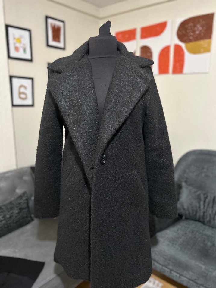 Tek düğmeli, siyah ve dokulu sıcak kumaştan uzun kaban. Klasik yaka tasarımına sahiptir. Yeni gibi iki kere giydim