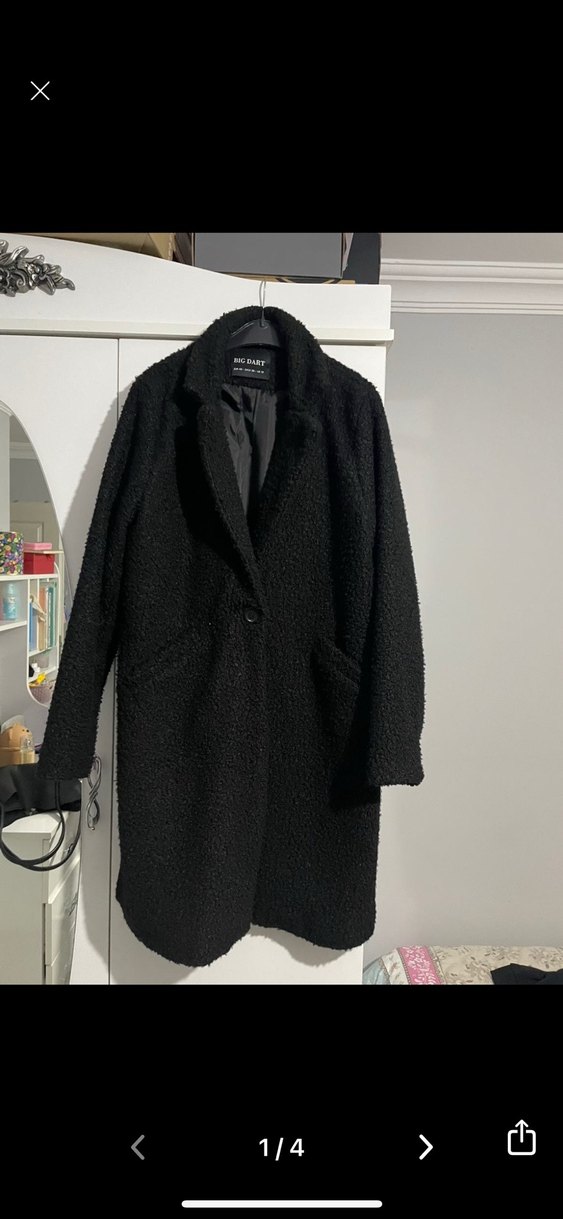 Yumuşak dokulu siyah tek düğmeli kaban, yaka detayı ve yan ceplerle birlikte. 40 beden