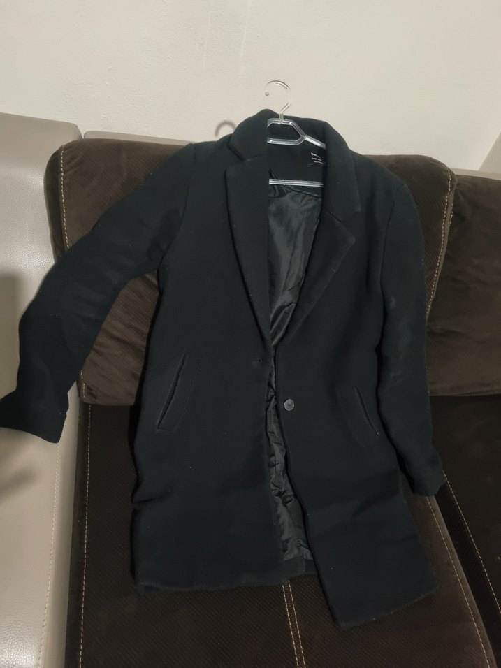 Yumuşak astarlı, tek düğmeli siyah kaban, klasik yakalı ve yan cepli, serin havalar için uygun.