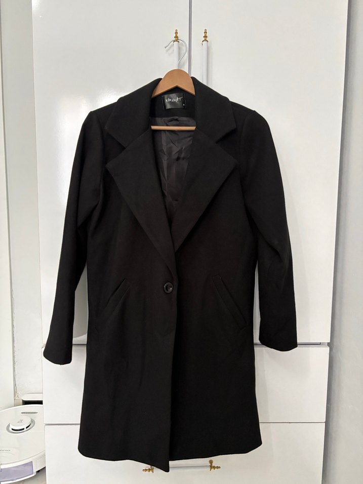 Tek düğmeli, klasik yakalı siyah kaban. İç kısmı astarlı ve uzun kolludur, şık ve sade bir tasarıma sahiptir.