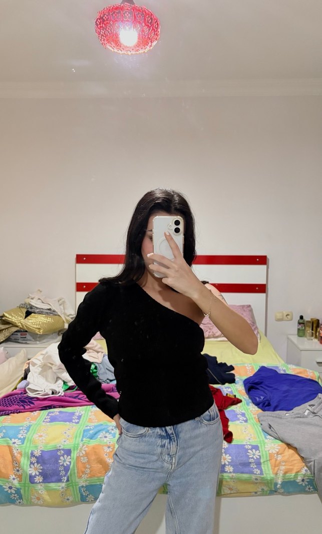 V yaka, uzun kollu ve tek omuz tasarımlı siyah denim bluz, günlük sokak stili için uygun ve şık bir seçim. ✨