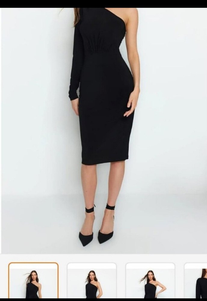 Bu siyah kalem elbise, tek kollu ve askılı detayıyla, yumuşak süet kumaştan üretilmiş, minimalist ve şık bir görünüme sahip, ofis için uygun.