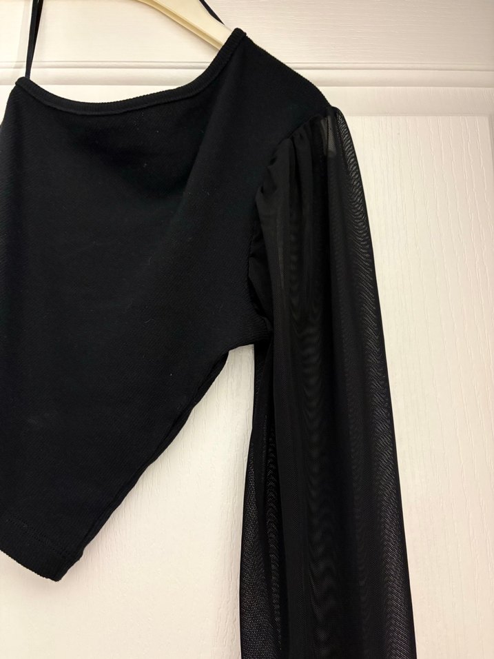 Fitted kesim siyah bluz, kayık yaka ve şeffaf sentetik kumaştan drapeli uzun kollara sahiptir