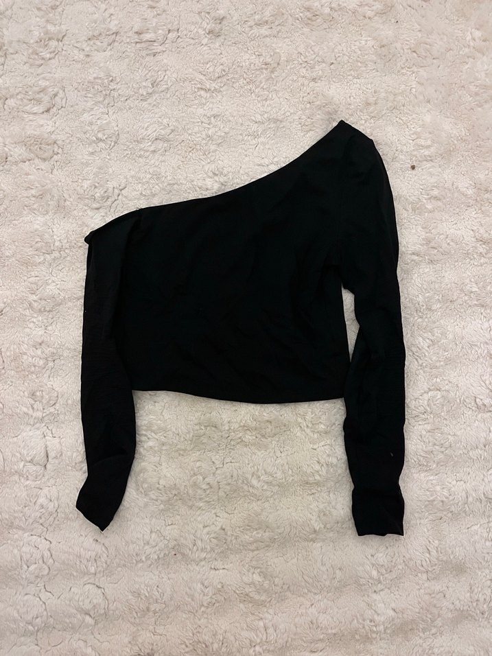 Siyah, tek omuz tek uzun kollu, yumuşak ve sıcak kumaşlı, tüylü detaylı, midi boyda, dar kesim kadın bluz. Sokak stili için uygun, rahat bir parça.