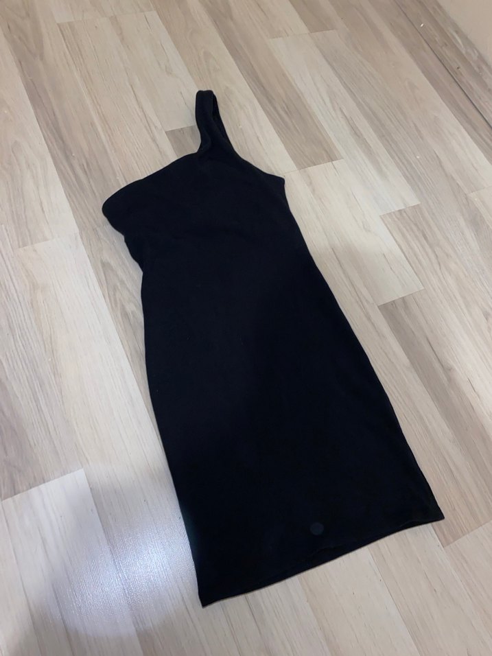 Tek omuzlu, siyah triko elbise, yüksek yakalı ve vücuda oturan midi boydadır. Rahat sentetik kumaştan, minimal ve şık bir günlük sokak stili sunar.