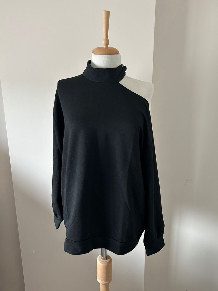 Siyah renkli kadın kazak, yüksek yakalı ve tek omuz tasarımına sahiptir. Uzun kollu, bol kesim ve yumuşak, sıcak kumaştan üretilmiştir.