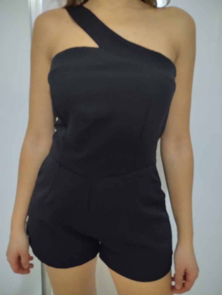 Siyah tek omuzlu kısa tulum, vücuda oturan kesimi ve minimalist tarzıyla parti için şık ve rahat bir seçenek sunar. Sentetik kumaştan yapılmıştır.