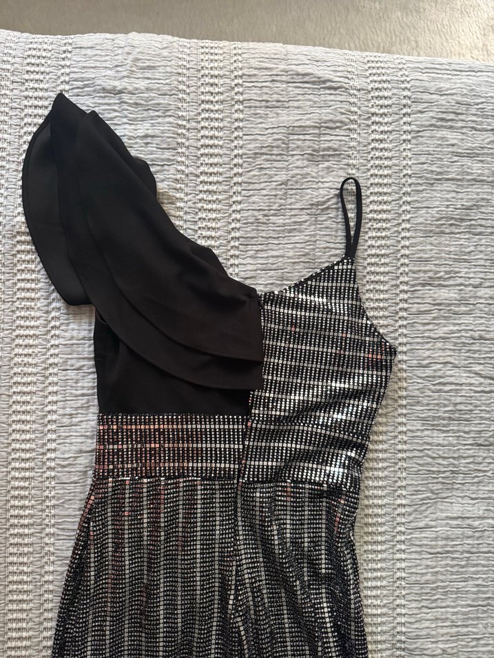 Bu dar kesim abiye elbise, payetli desenli kumaş ve tek omuzda fırfır detayıyla parti için uygundur. Straplez ve ince askılı tasarıma sahiptir. ✨