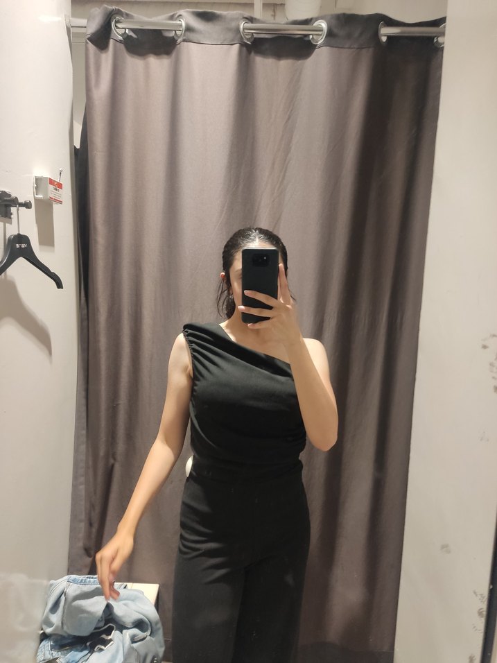 Siyah, tek omuzlu ve kolsuz, vücuda oturan tulum. Minimalist tarzda, şık