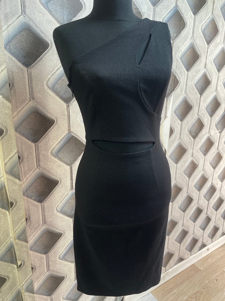 Siyah, tek omuzlu, ince askılı, uzun ve fit kesim abiye elbise. Çağdaş tarzda, ofis için uygun ve yırtmaçlıdır.