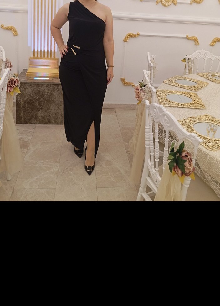Siyah, ipeksi uzun elbise; v yaka, tek omuzlu ve yırtmaçlıdır. Modern tarzda, sıkı kesimli ve romantik akşamlar için uygundur.