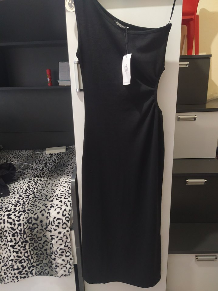 Siyah, tek omuzlu, kolsuz uzun elbise, straplez yaka ve yırtmaç detayına sahip, düz ve şık sentetik kumaştan üretilmiştir. Ofis için uygun, minimalist ve sokak stili tarzında.