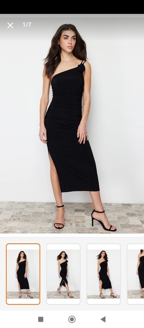 Siyah süet kumaştan, tek omuz askılı, V yakalı, drapeli ve vücuda oturan uzun elbise. Romantik akşamlar için uygundur.