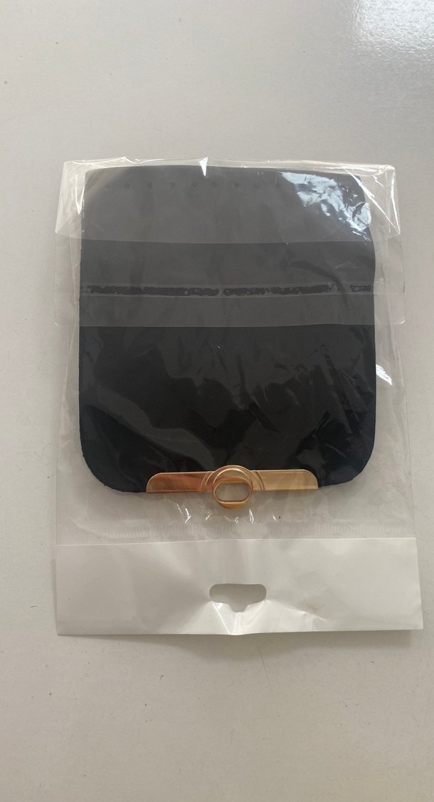 Alt kısmında küçük metalik halka bulunan siyah renkli, sade dikdörtgen tasarımlı telefon tutucu.