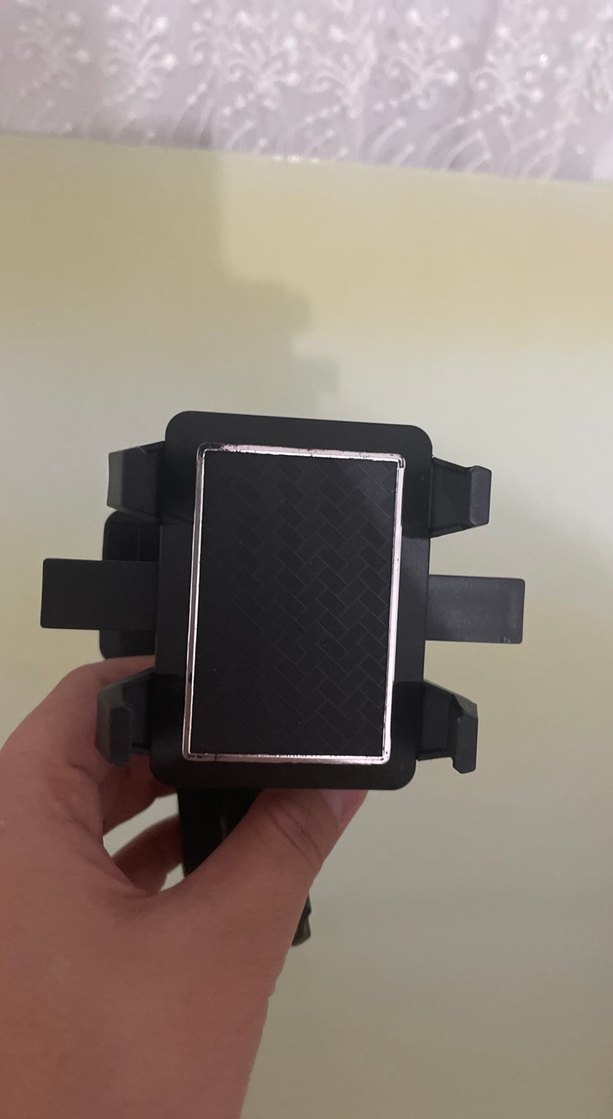Ayarlanabilir kollara sahip, araç içinde güvenli tutuş sağlayan siyah telefon tutucu. Ürünü arabanın ön tarafına ittirerek takılıyor