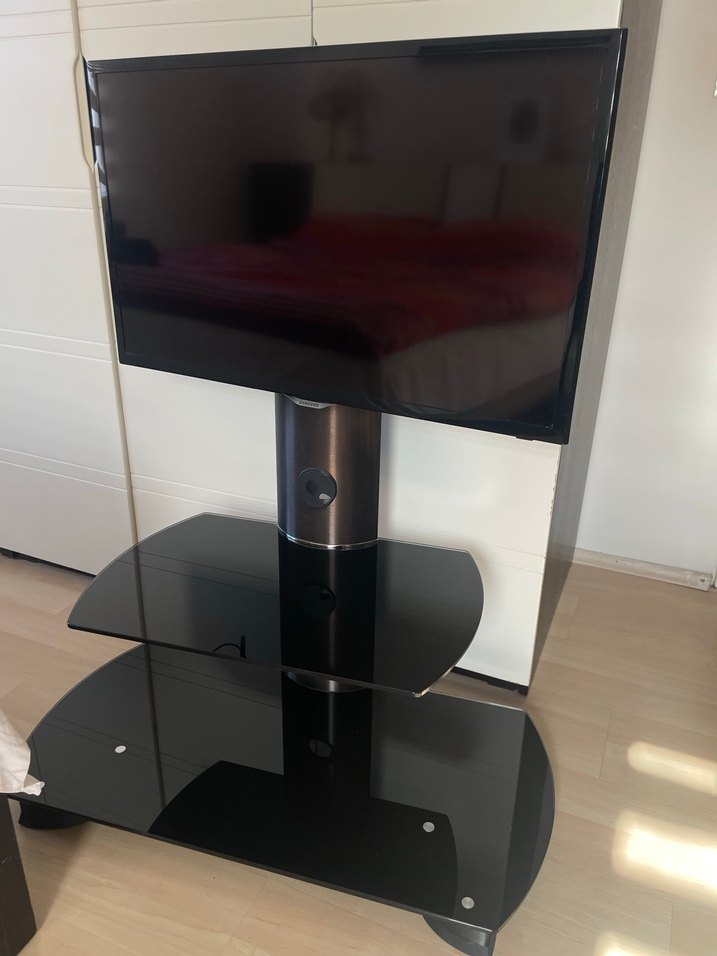 Siyah , metal ve cam malzemeden oluşan stand üzerinde iki cam rafla birlikte sunulmaktadır. Ekstra cihazlar için alan sağlar. Ölçüleri fotoğrafta görünüyor tercihe bağlı olarak televizyonda satılabilir fiyat güncellemesi yapılarak. Elden teslim
