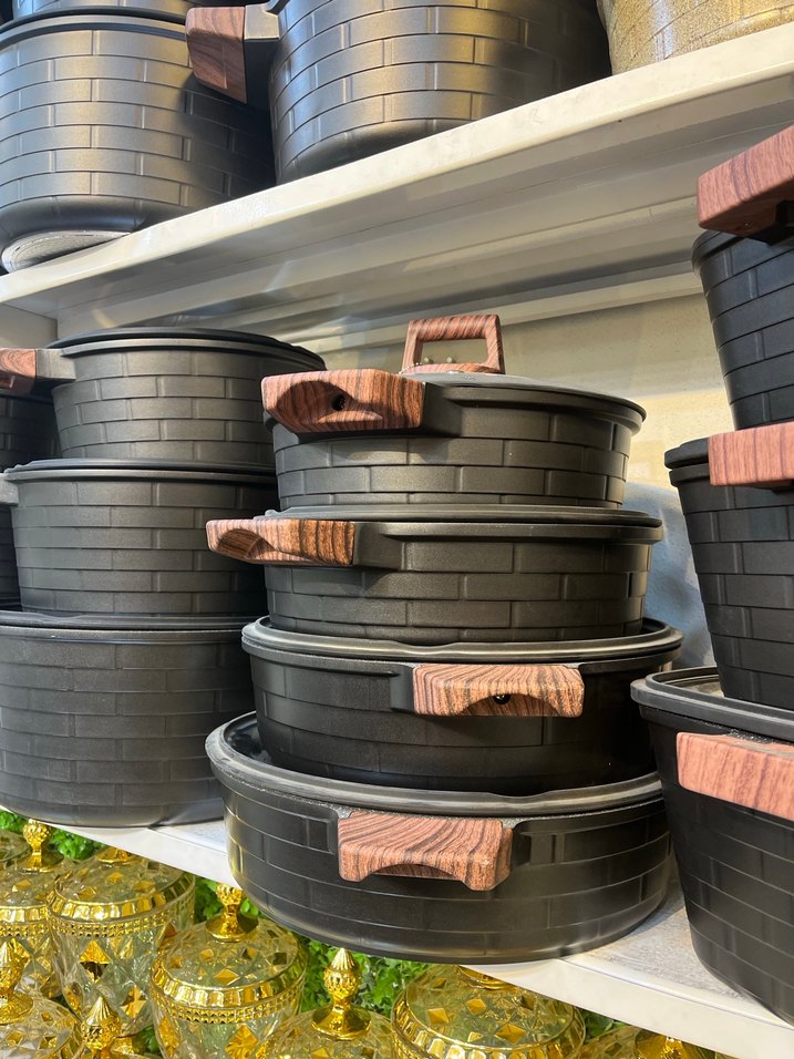 Ahşap saplı siyah tencerelerden oluşan set, çeşitli yemekler için uygundur. Mat koyu renkte olup kolayca üst üste konabilir.