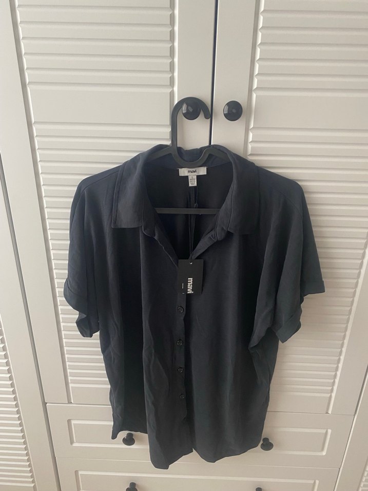 Lacivert modal kumaş gömlek, kısa kollu ve yakalıdır. Salaş kesim, düğmeli ön ve normal midi boydadır. Ofis için minimal sokak stiline uygun. Sıfır ürün.