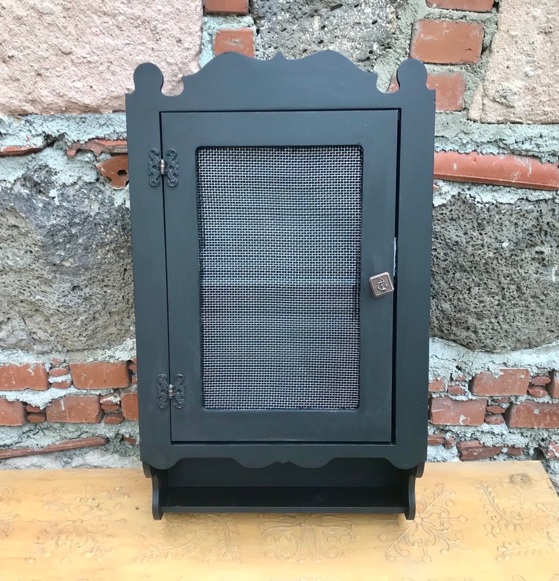 56.33.14 cm ölçüsünde siyah fincan baharatlık dolabı. Tel dolap. Duvara asılır.