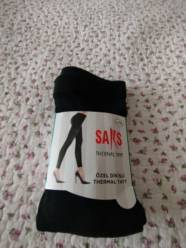 Saks marka, yumuşak sentetik kumaştan, elastik bel bantlı siyah termal tayt. Günlük kullanıma uygun, rahat ve gotik desenli.